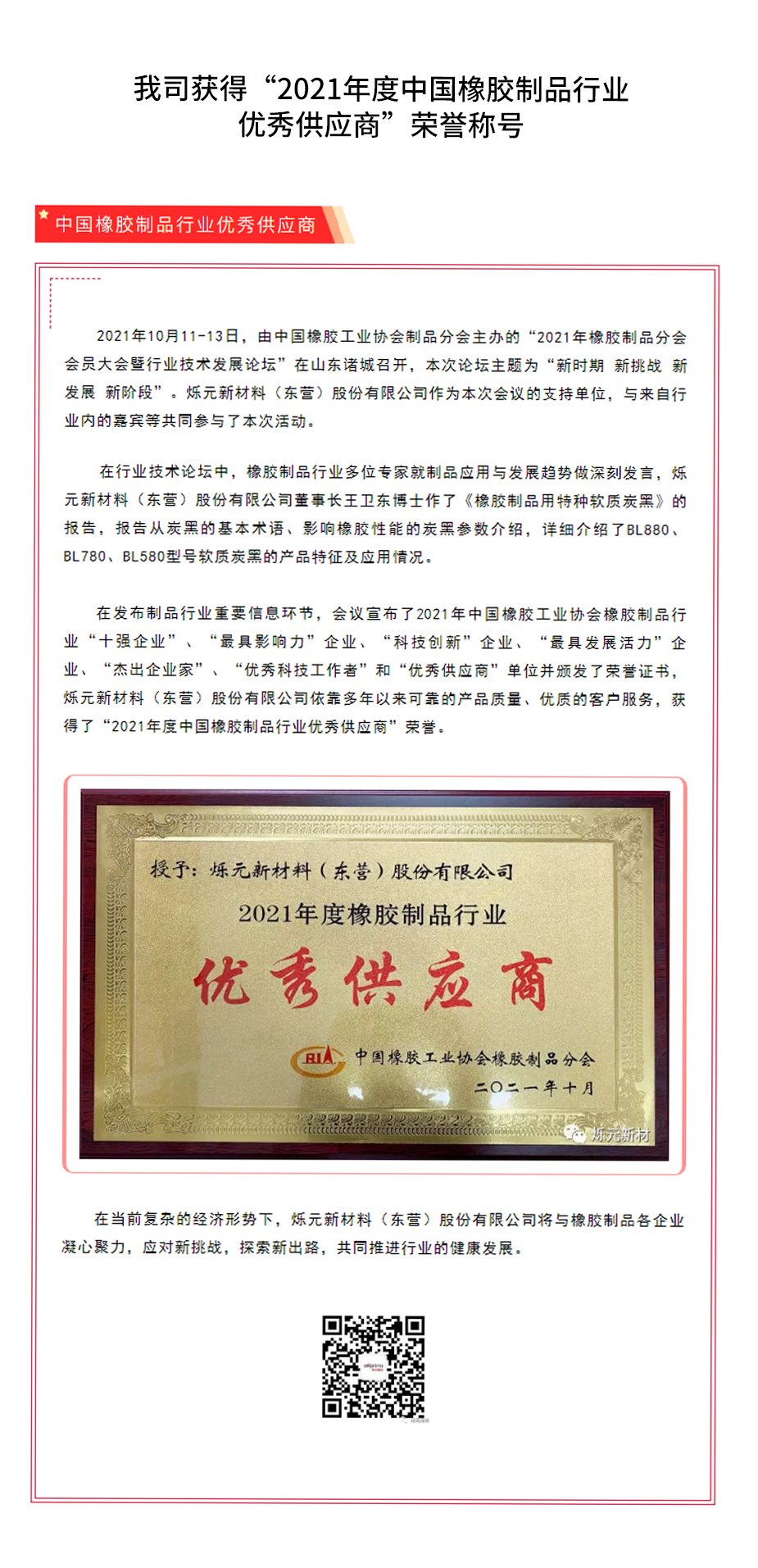 我(wo)司獲得“2021年度(dù)中國橡膠制(zhi)品行業 優秀(xiù)供應商”榮譽(yu)稱号
